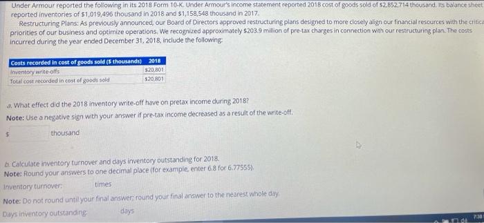Under Armour reported the following in its 2018 Form Chegg
