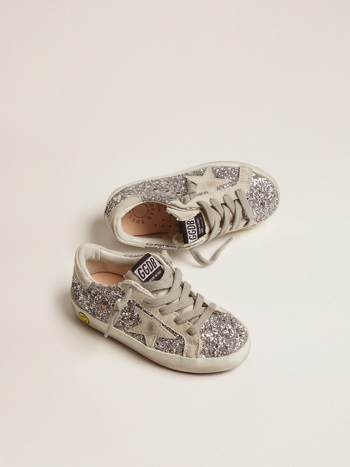 Women s Super Star with silver sparkle foxing and metal stud lettering