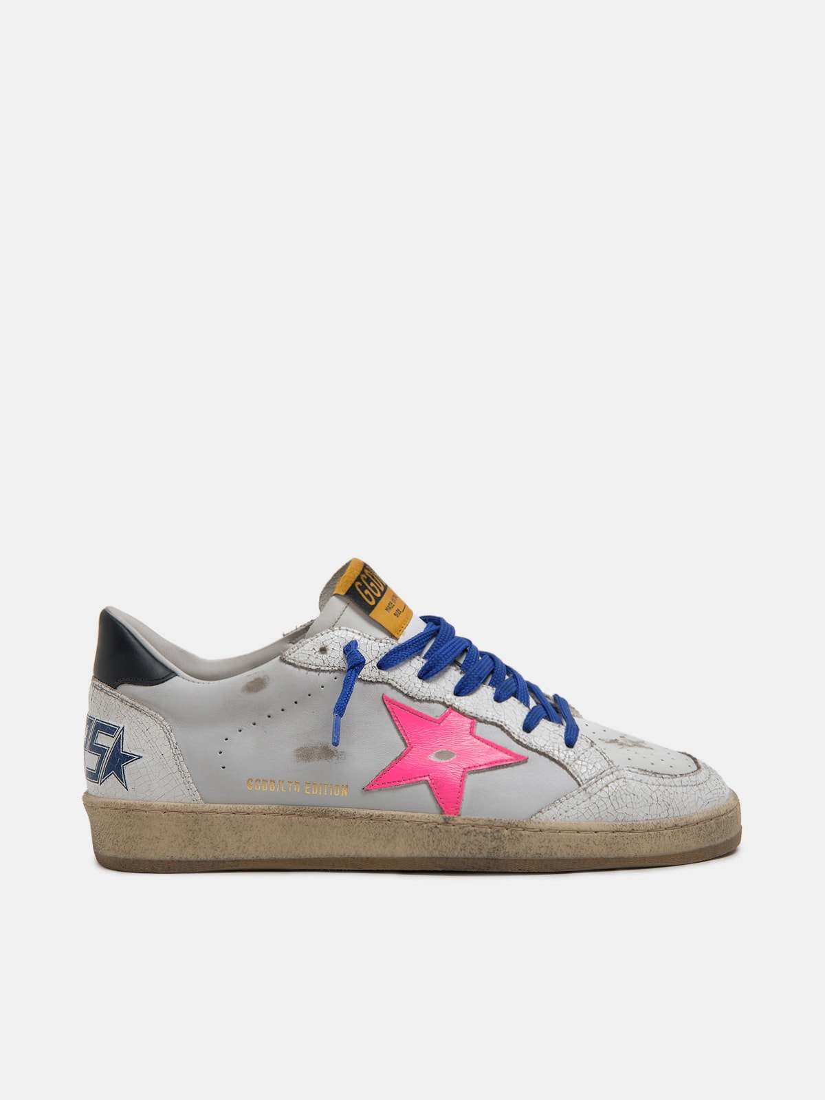 Women s LTD Ball Star sneakers with cracked leather inserts fluorescent fuchsia star and blue laces