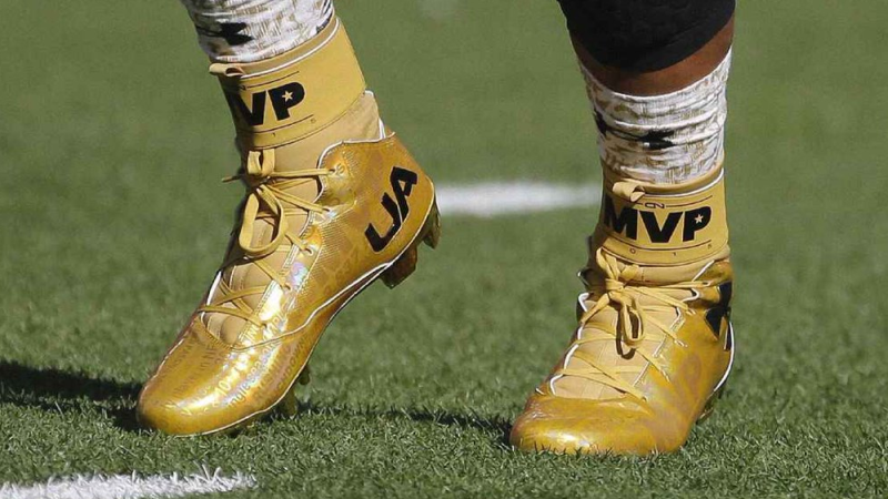 Superbowl 50 NFL MVP Cam Newton wears gold cleats with statistics